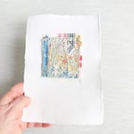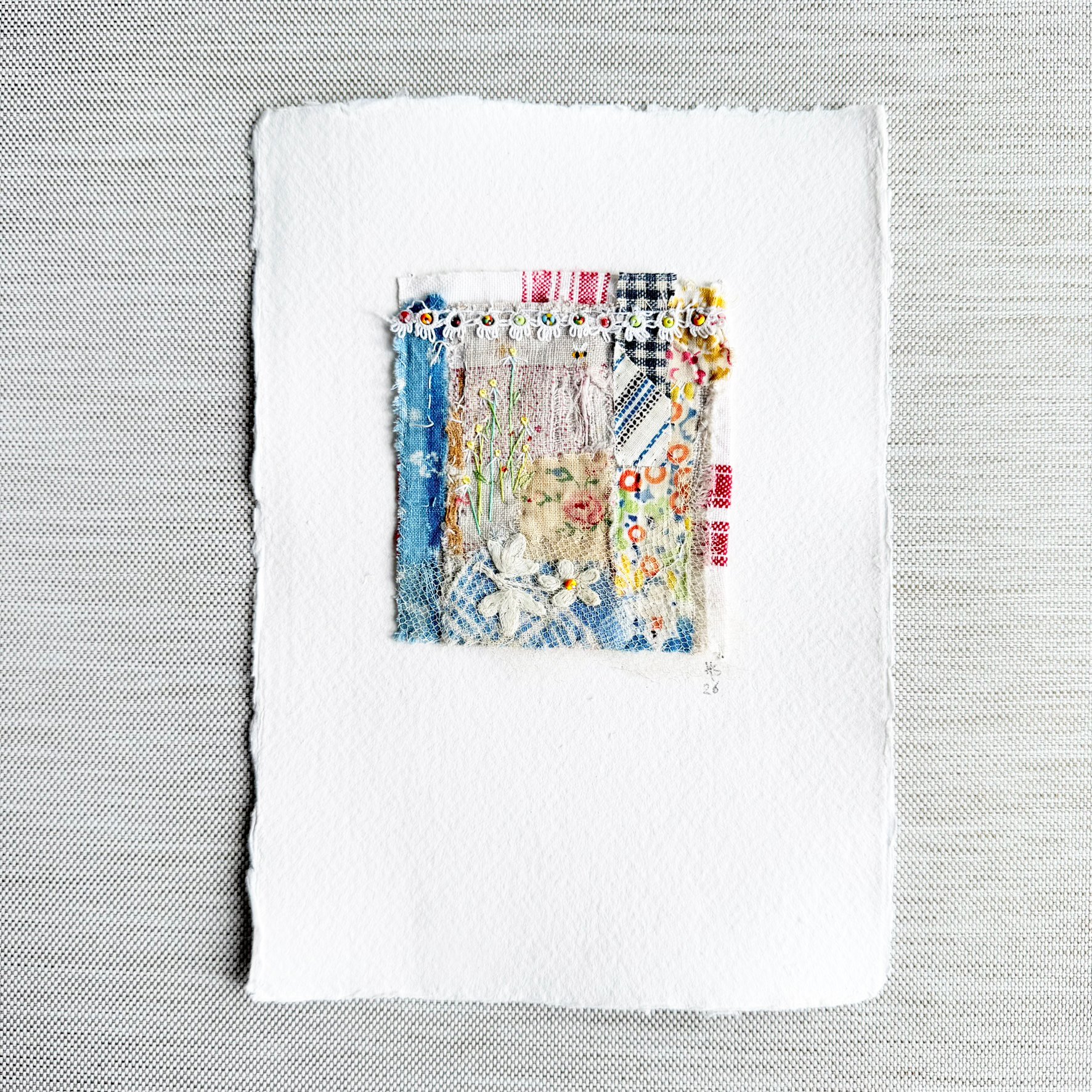 Fabric backing. Tacked to a piece of A5 handmade card.