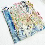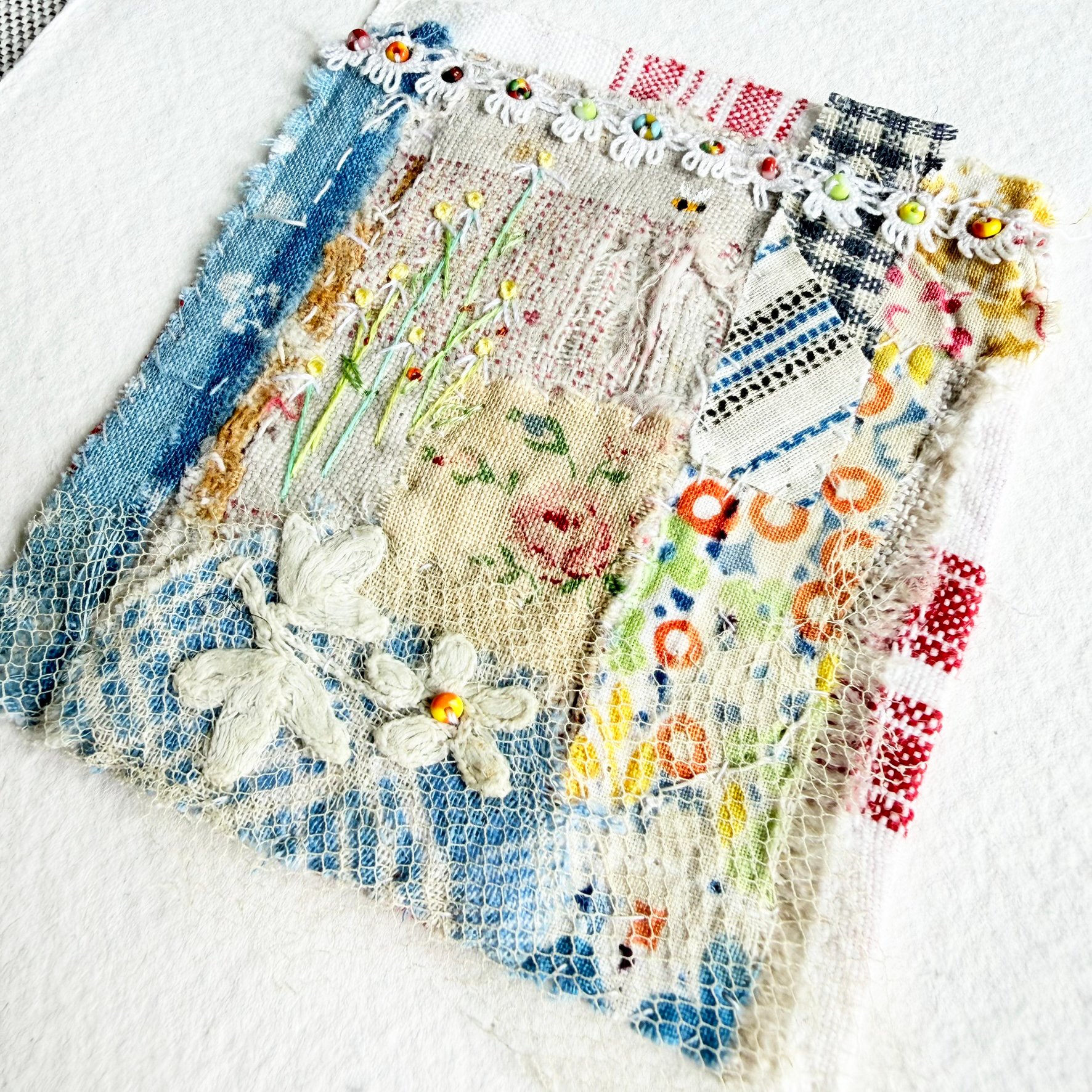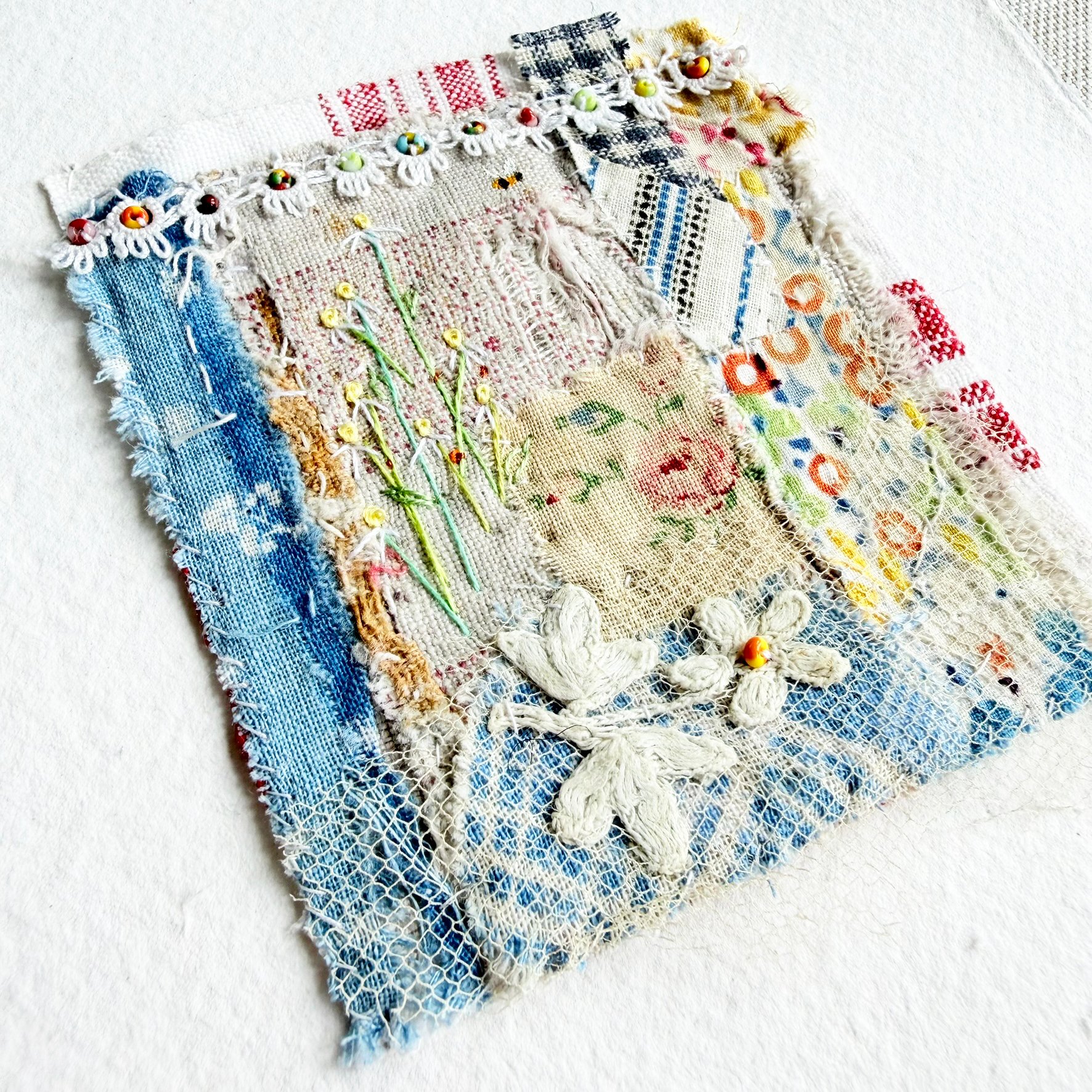 This is an original handmade textile piece, created with collaged antique fragments, with hand stitching and my embroidered flowers. Beads have been added and a painted buzzing Bee.