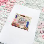 Hand stitched to a fabric backing. In turn, tacked to a piece of A5 handmade card.