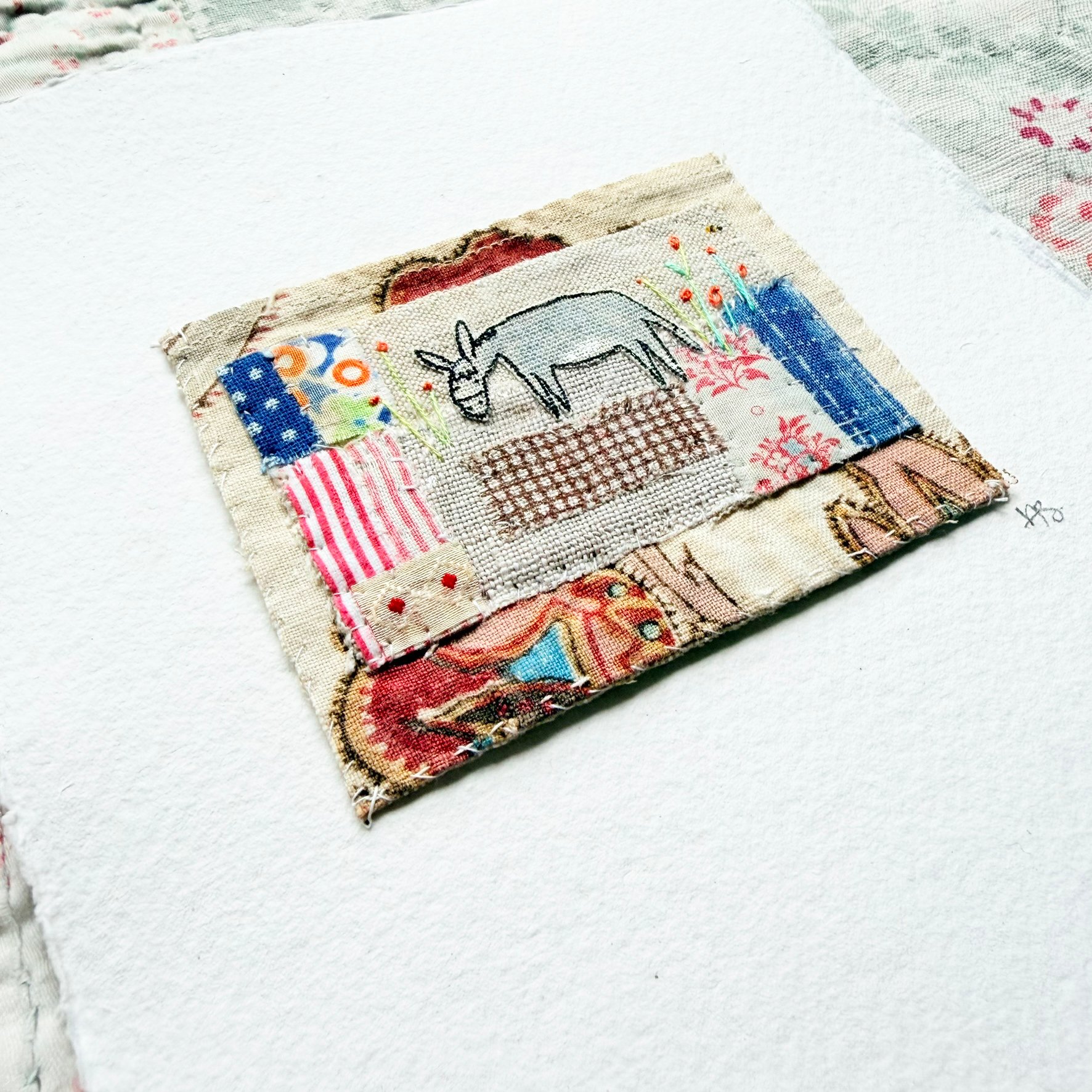 I have collaged time worn, antique fabric fragments, with hand stitching, to create a textural layer. To which, I have embroidered flowers and applied my painted Dennis the Donkey, with painted teeny Bee.