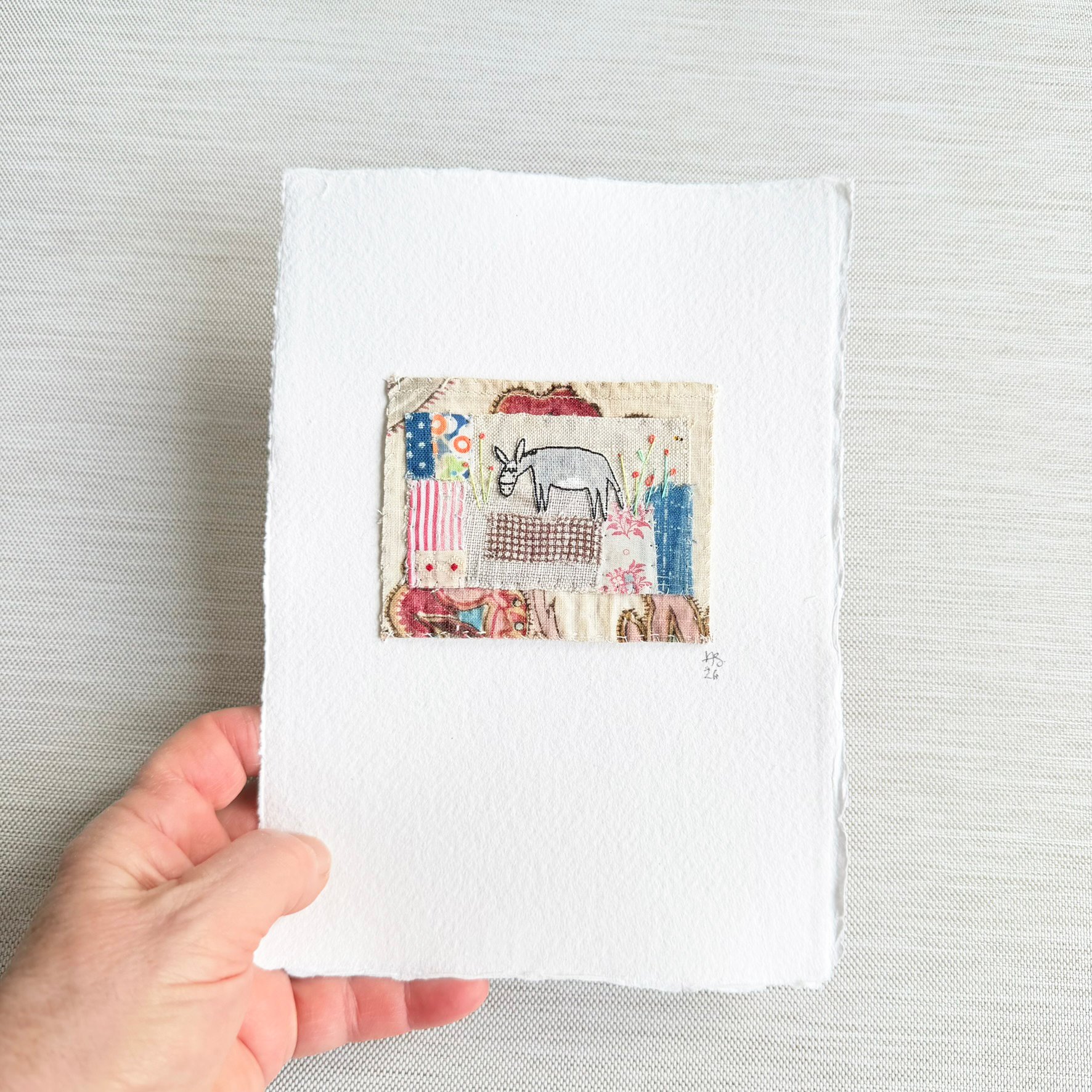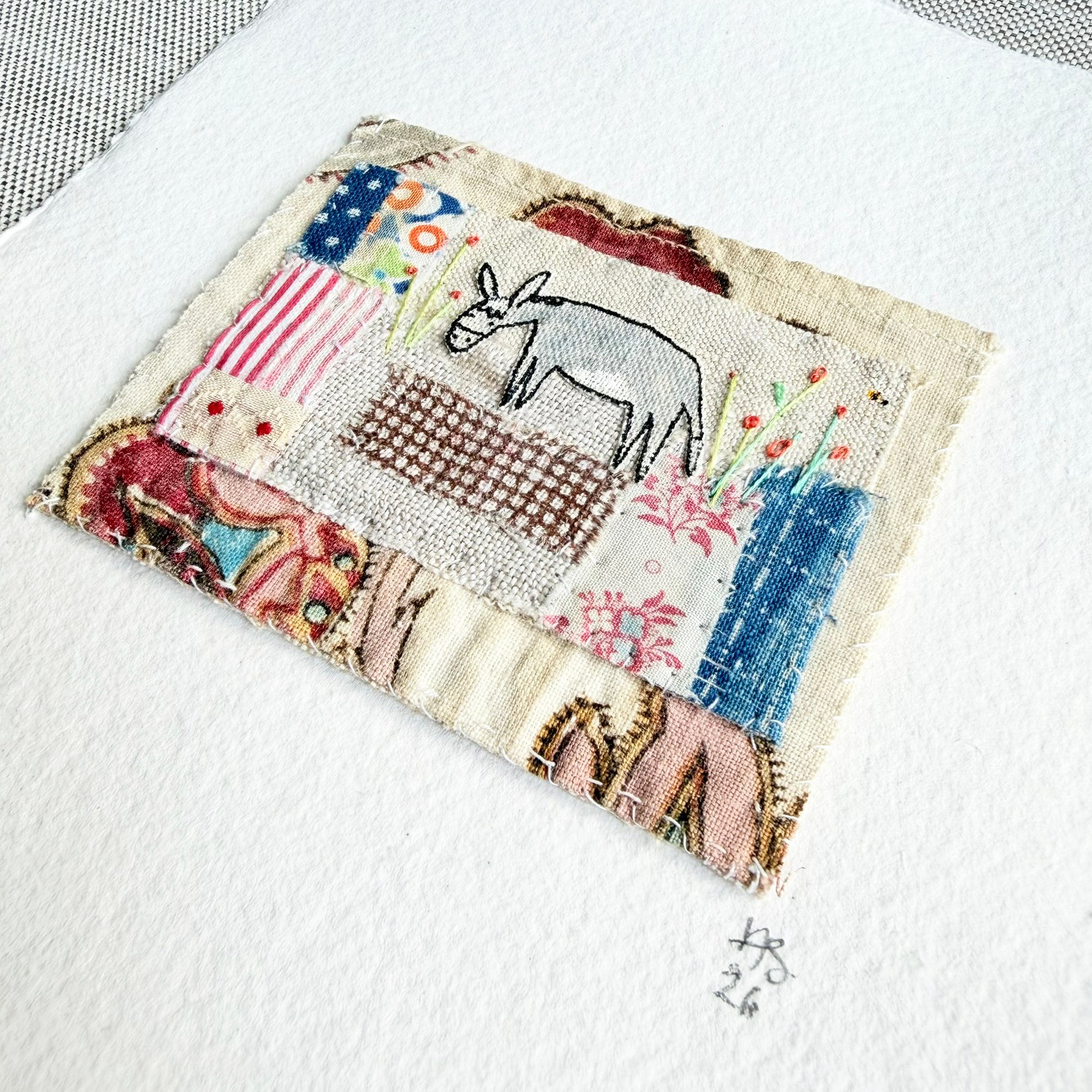 Fabric backing. Tacked to a piece of A5 handmade card.