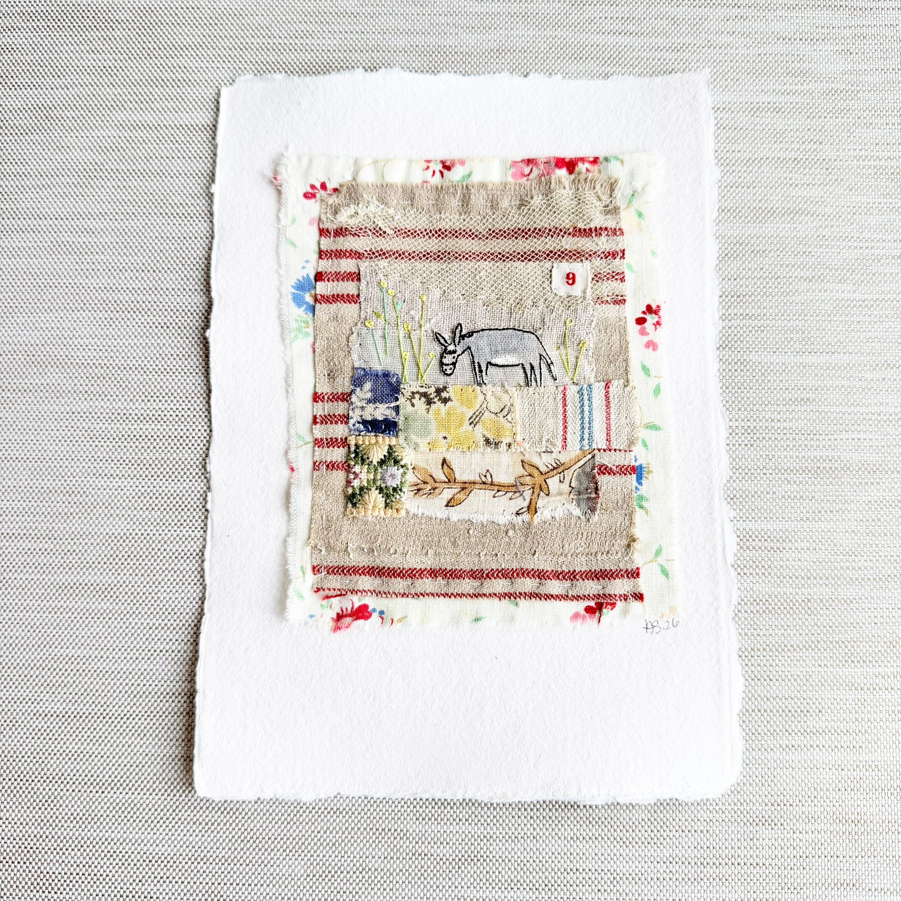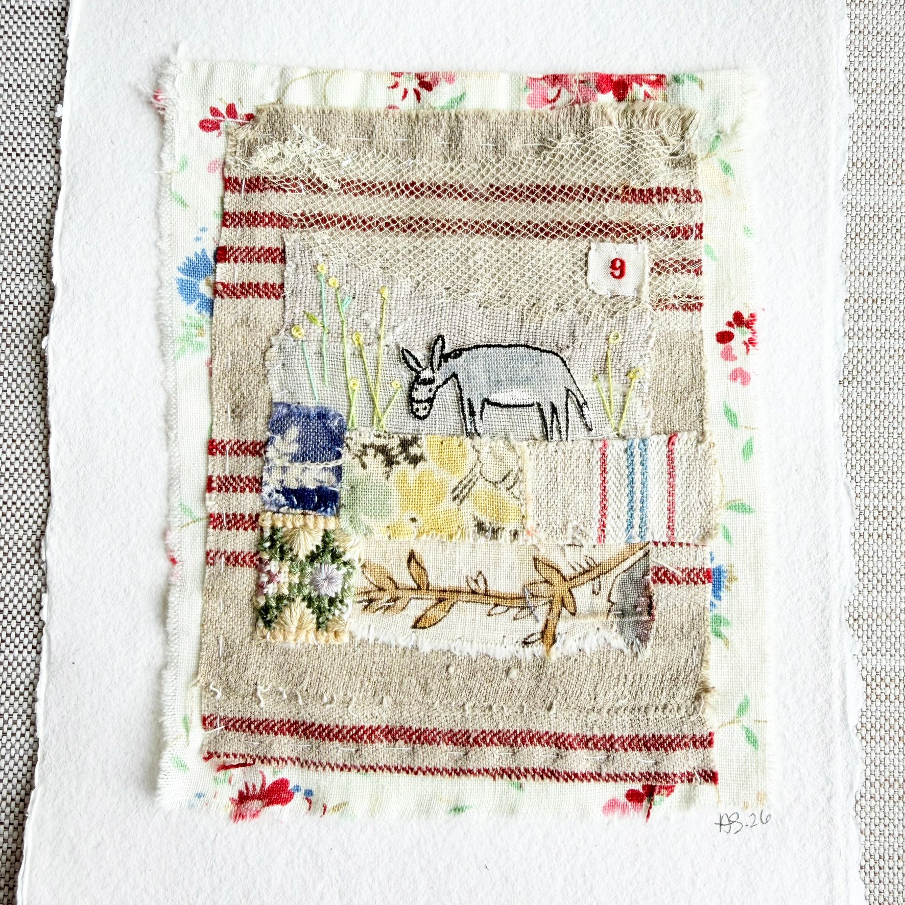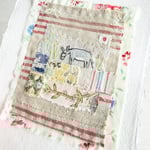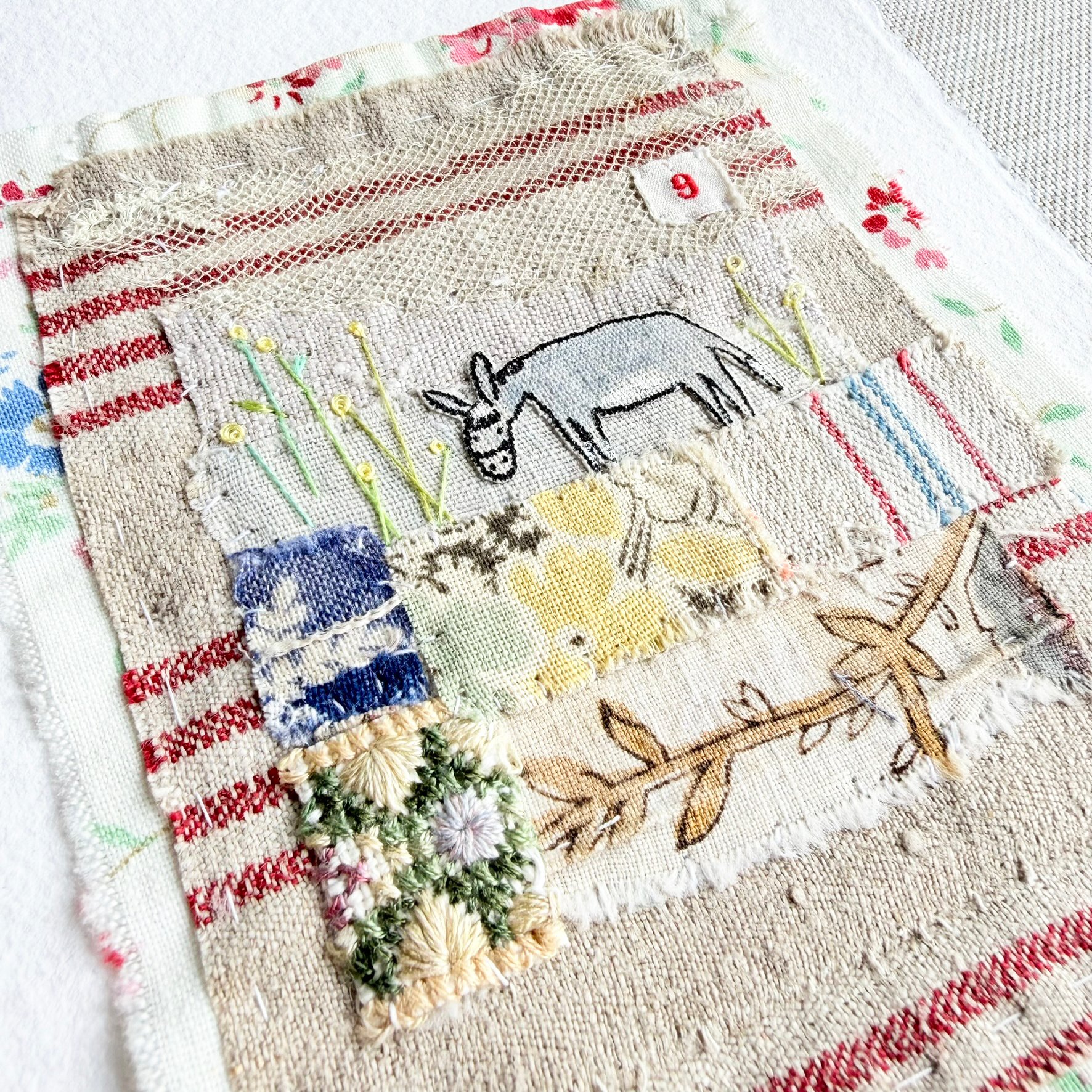 This is an original handmade textile piece, created with collaged antique fabric fragments, with hand stitching and embroidery. Featuring Dennis the Donk.