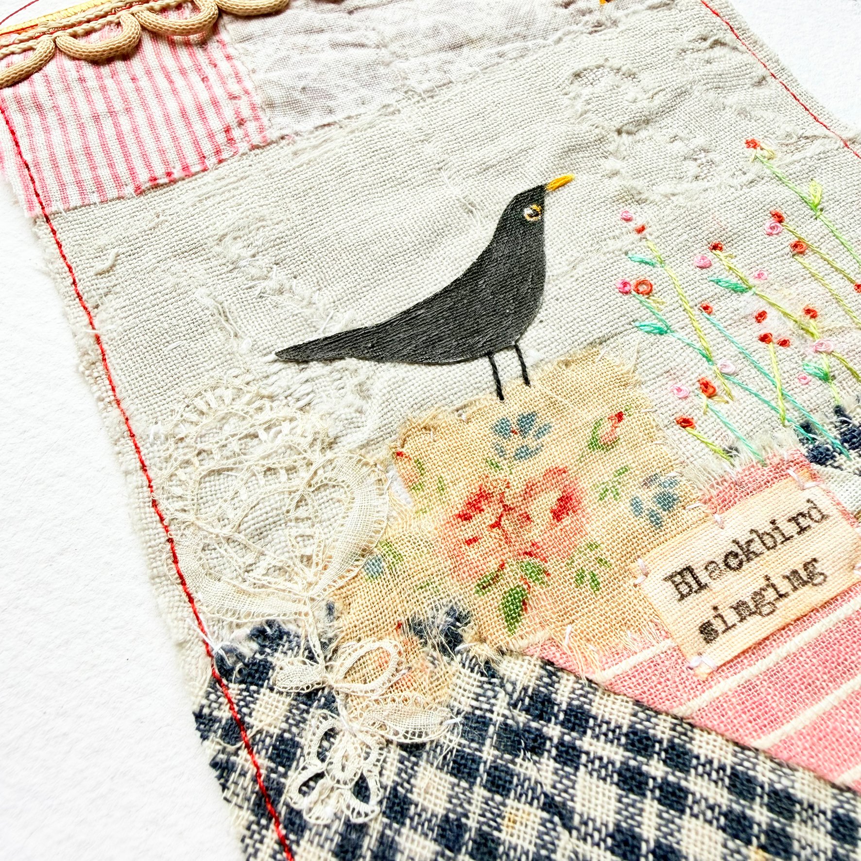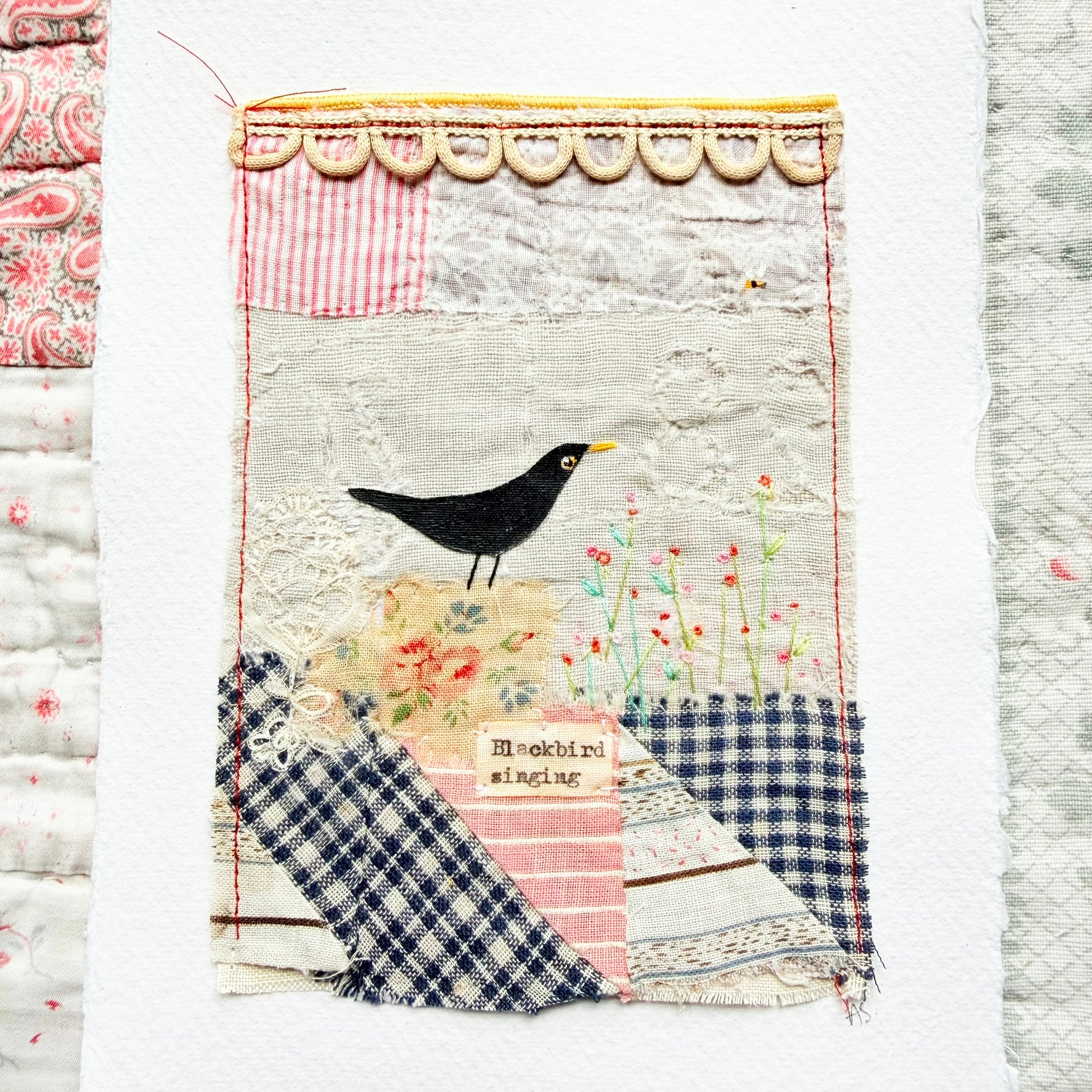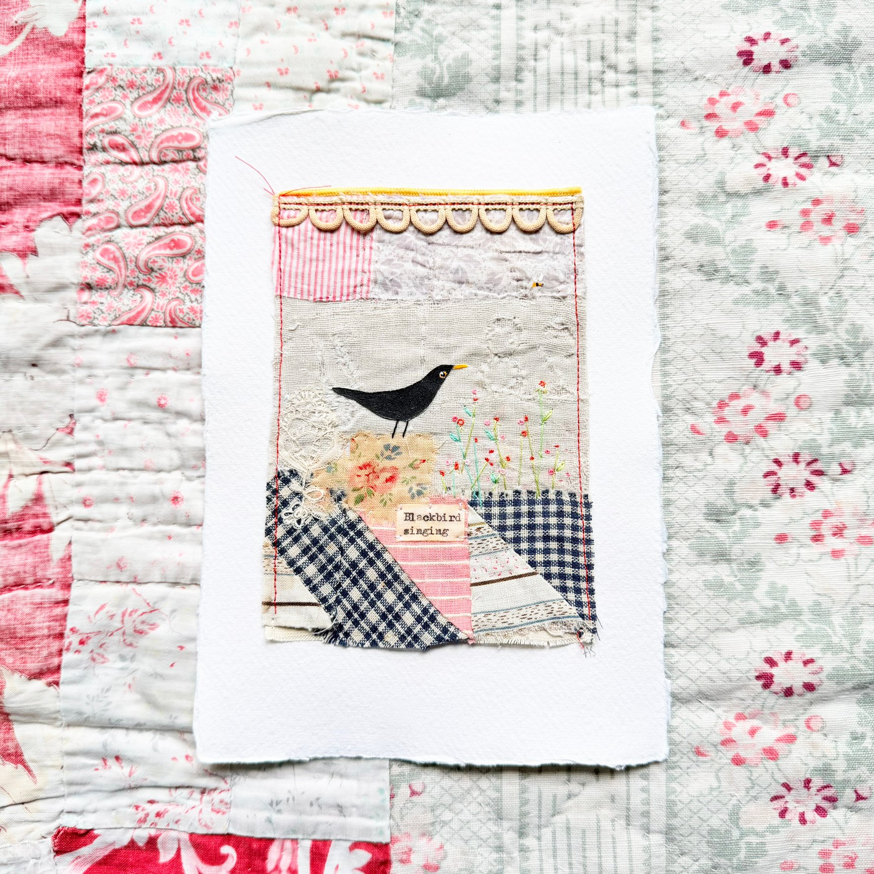 Artwork - ORIGINAL - Blackbird singing - textile hand stitched collage