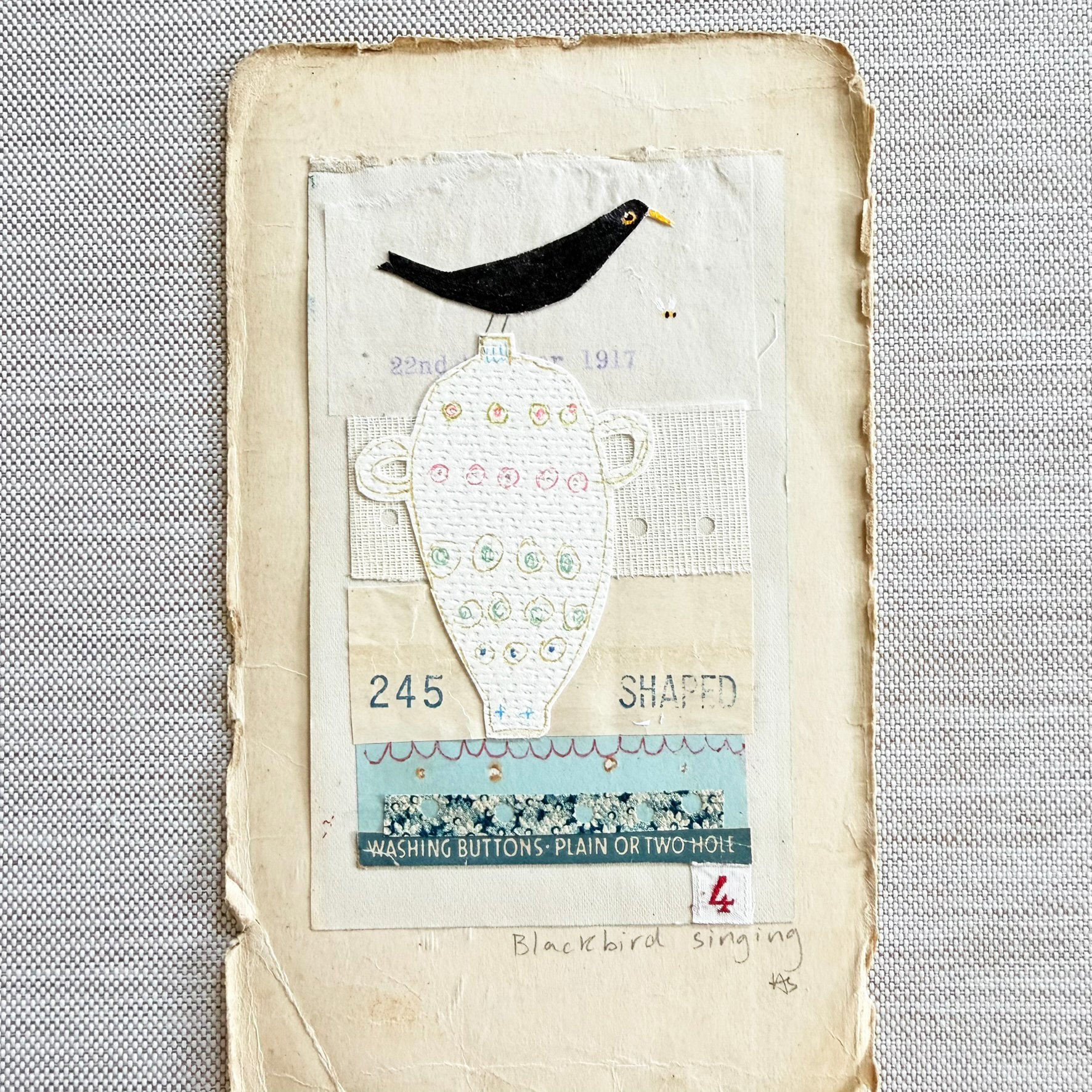 Here we have an original mixed media piece, created from British antique and vintage paper ephemera. Showcasing my painted Blackbird, standing on a hand drawn and cut out vase.